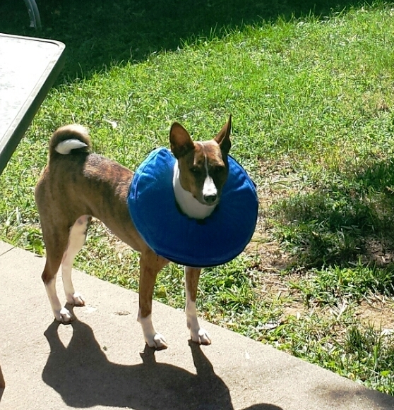 I got little inflatable donuts for my tiny girl to wear if needed. I was able to work at home for a day or two, and then for several days took Tiegan to work with me in the afternoon so she only had to wear the donut in the morning when I was at aerobics. She was very good and did not scratch at her incision. Miles was also remarkably good and did not bother her incision. She healed beautifully. The alien monster has been vanquished.